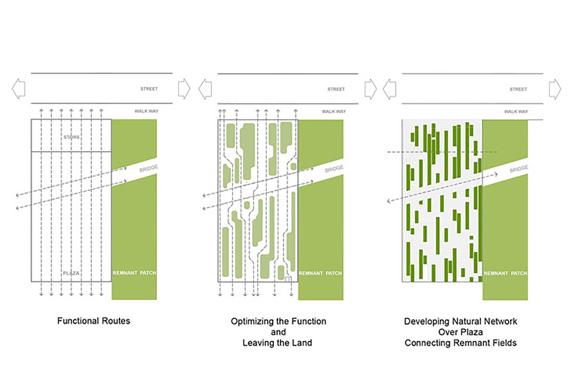 راه حلهای جامع و پایدار به گونه ای که با نگاه بین رشتهای، توسعه شهر و حضور انسان را با حفظ و احیای حوزه های طبیعی فراهم می سازد به عنوان مهمترین رویکرد در طراحی این حوزه از شهر مورد توجه قرار گرفته است و به این ترتیب این میدان، با هدف ارائه راه حلی برای نیل به توسعه پایدار در فضاهای باز شهری، طراحی و اجرا شده است. وسعت فضای اجتماعی و ارتباطی در برابر وسعت فضای طبیعی مورد مطالعه قرار گرفته و سعی شده است که میزان پوشش سطح طبیعی خاک به شرطی که عملکرد شهری میدان را تحت شعاع قرار ندهد به حداقل ممکن برسد. در شکل تپه کمترین دخل و تصرف شده است و ارتباط معبر با قسمت مسطح میدان با پله های محاصره شده با بستر طبیعی امکان پذیر
