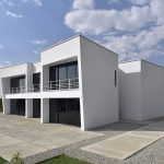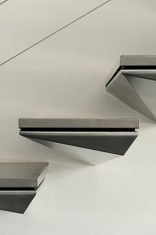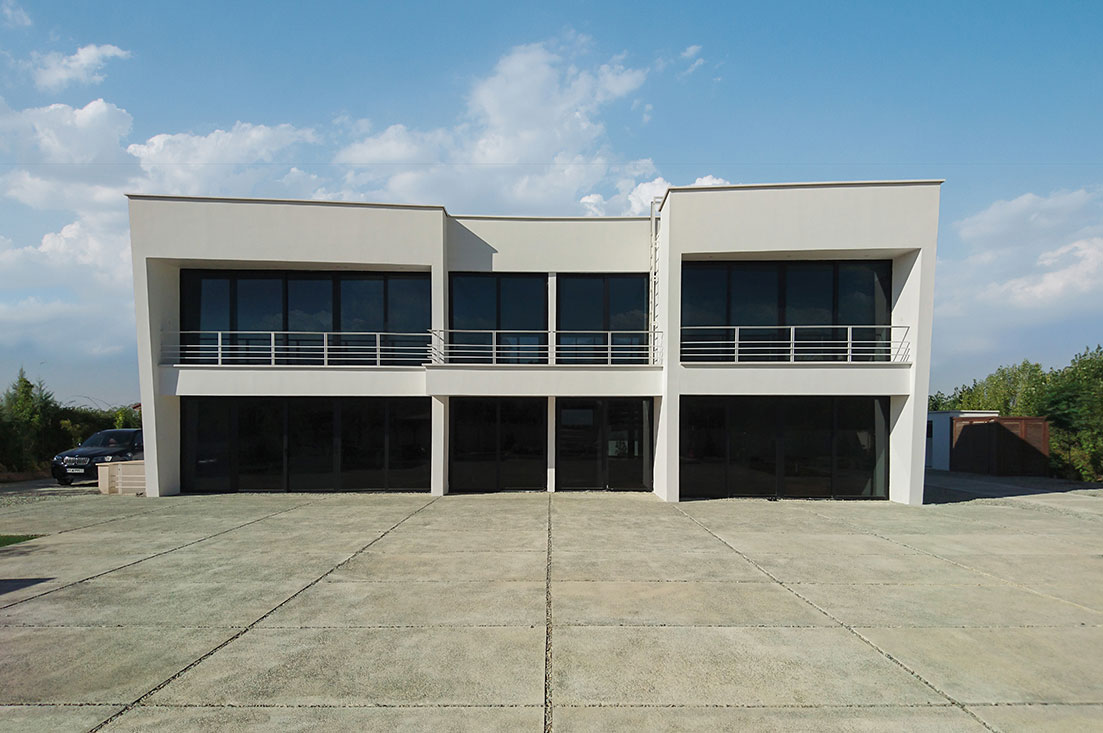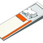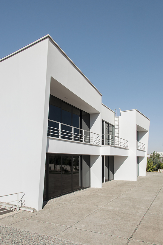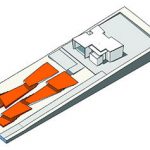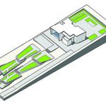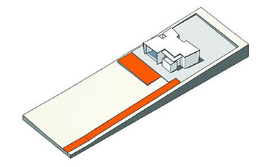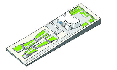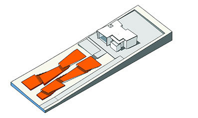 در برخورد با عرض کم سایت و طول زیاد آن، حجم اولیه با جداره های صلب و بسته رو به واحدهای کناری در نظر گرفته شد و بر خلاف آن، جداره های رو به محوطه جلو و پشت تماماً شفاف و باز دیده شد. دو محور عمود بر هم دسترسیها و ارتباط ها با چهار طرف بنا را شکل داد که برای کنترل و بهبود نور، دید و دسترسی ، محور عرضی به دو سمت جابجا شد. حجم اولیه به وسیله این دو محور به چهار مکعب تقسیم شد که ابعاد هر کدام بر پایه ویژگیها و کیفیتهای مورد نظر فضایی که در بر میگیرند تغییر کرد.