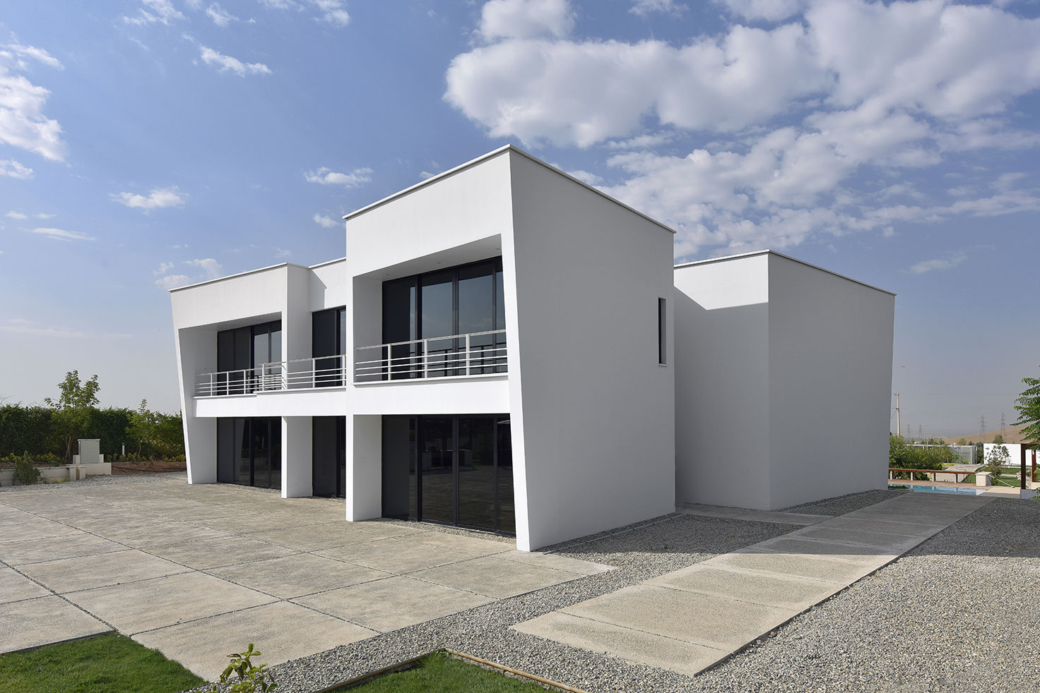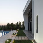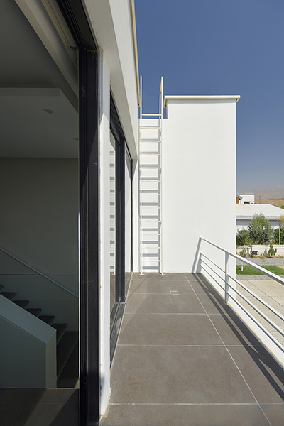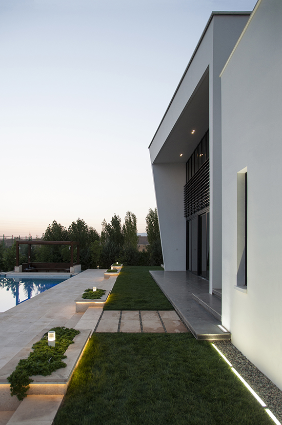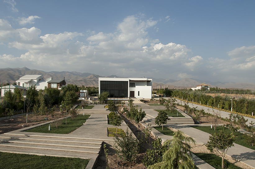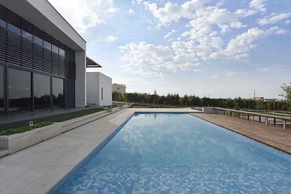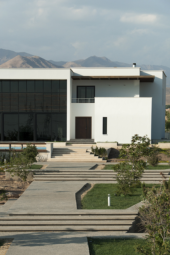همانطور که گفته شد ساختمان زمین را به دو محوطه در پشت و جلو تقسیم میکند. در محوطه جلو حرکت سکوهای شناور برروی یکدیگر شیب زمین را حل میکنند. استخر در فضای روبروی بنا و در ارتباط با نشیمن اصلی و ووید دو طبقه قرارگرفته است. اما بر خلاف محوطه جلو، در پشت فضایی آرام دیده شده که سطح صاف و هم ارتفاع آن با درون بنا امکان ارتباط خواسته شده طراحی را فراهم میکند و هم بنا از بیرون و هم محوطه از درون تماما قابل درک باشند.