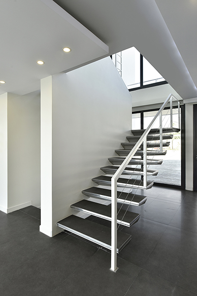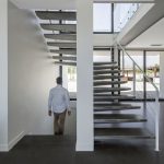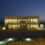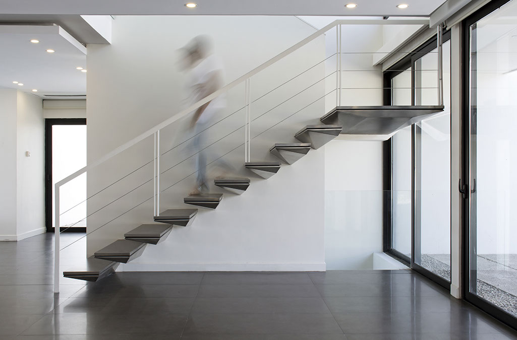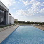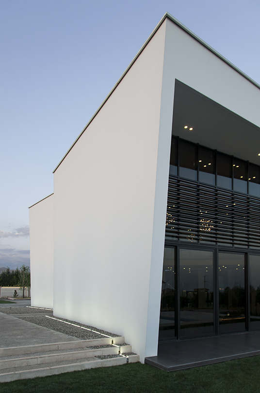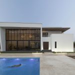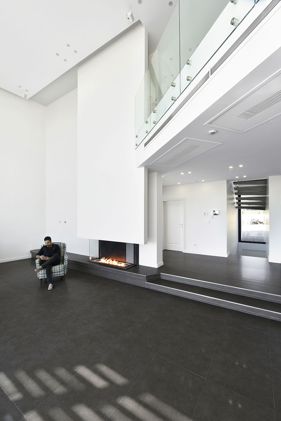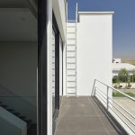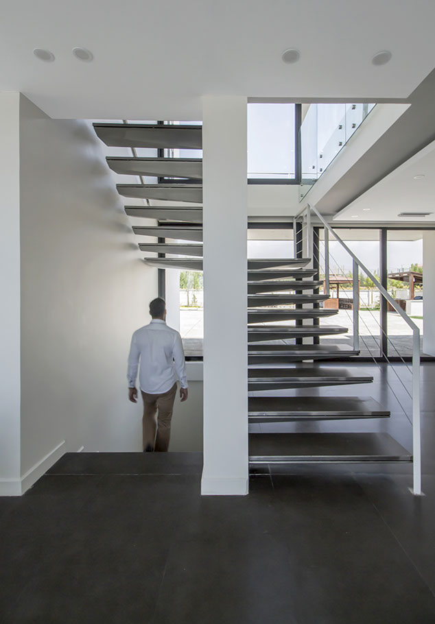 همانطور که گفته شد ساختمان زمین را به دو محوطه در پشت و جلو تقسیم میکند. در محوطه جلو حرکت سکوهای شناور برروی یکدیگر شیب زمین را حل میکنند. استخر در فضای روبروی بنا و در ارتباط با نشیمن اصلی و ووید دو طبقه قرارگرفته است. اما بر خلاف محوطه جلو، در پشت فضایی آرام دیده شده که سطح صاف و هم ارتفاع آن با درون بنا امکان ارتباط خواسته شده طراحی را فراهم میکند و هم بنا از بیرون و هم محوطه از درون تماما قابل درک باشند.