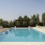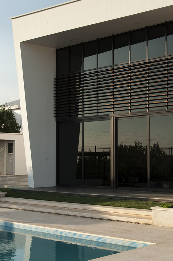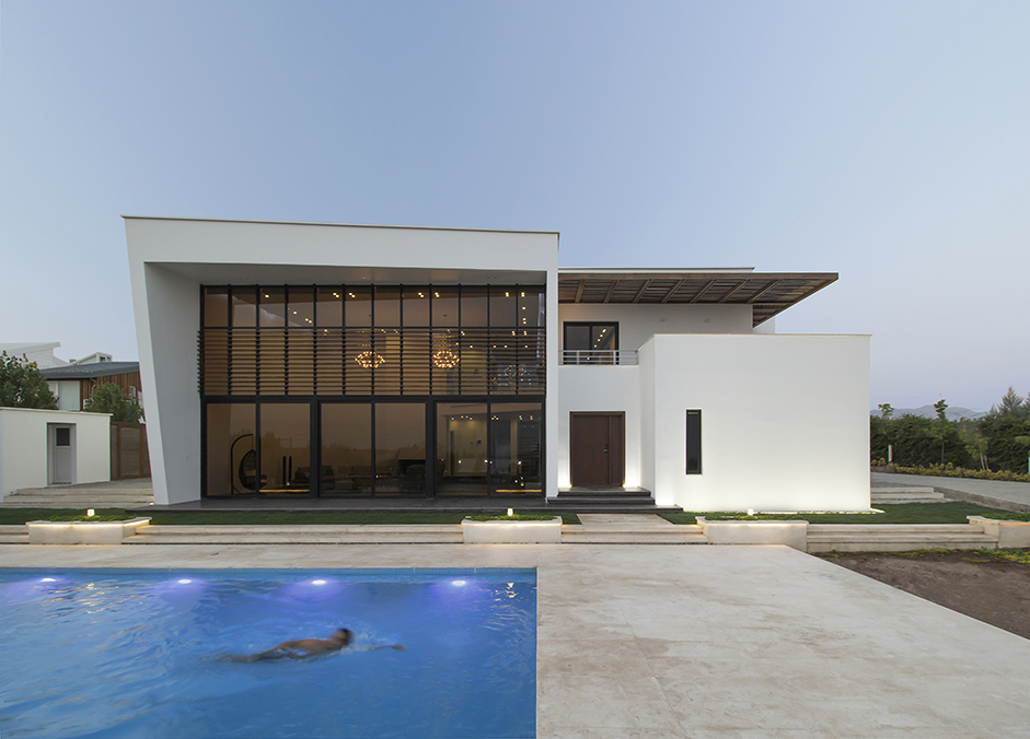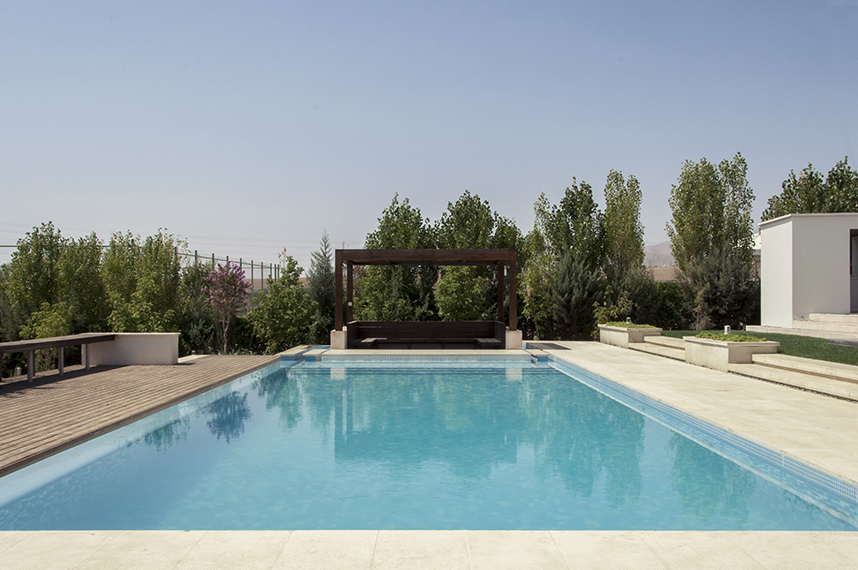 وجود این جریان طبیعی از سمت غرب یکی از دلایل قرارگیری استخر در روبروی ساختمان است که با عبور جریان از روی آب دما و رطوبت آن بهبود می یابد. استخر در فضای روبروی بنا و در ارتباط با نشیمن اصلی و ووید دو طبقه قرارگرفته تا حضور آب و سطح آینهای آن کامل کننده حس فضایی باغ و فضای سبز باشد.