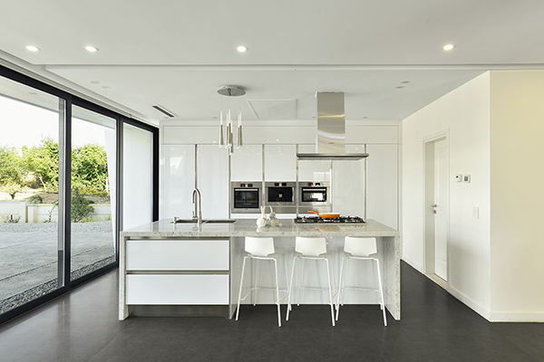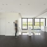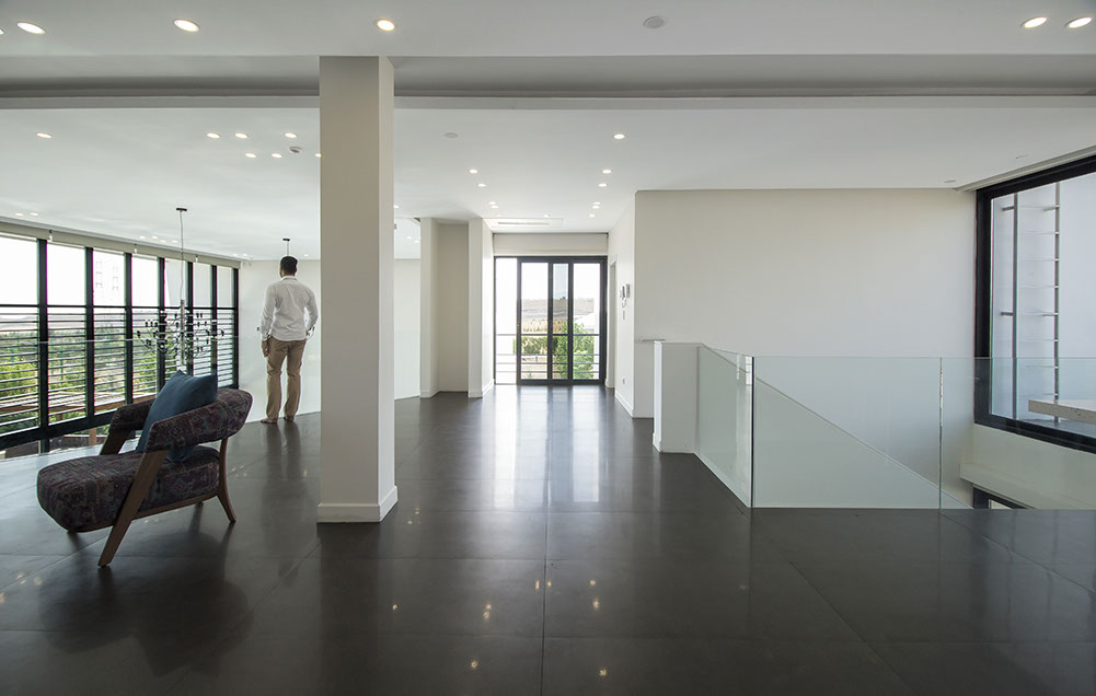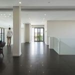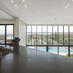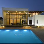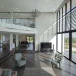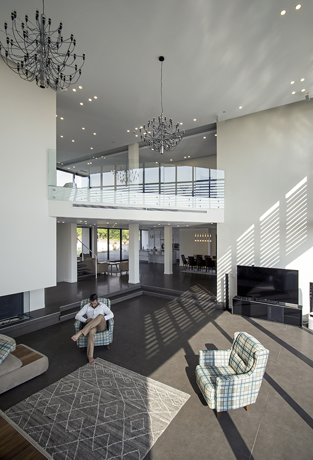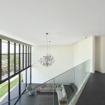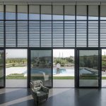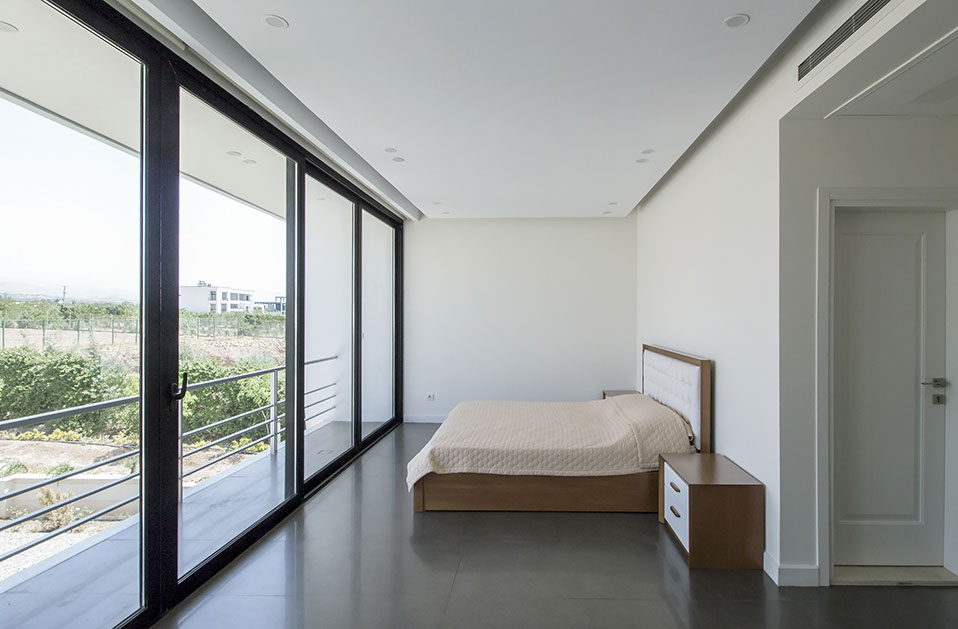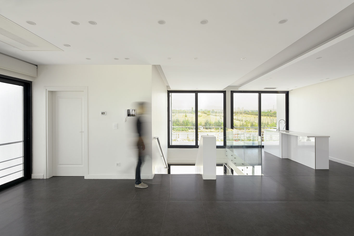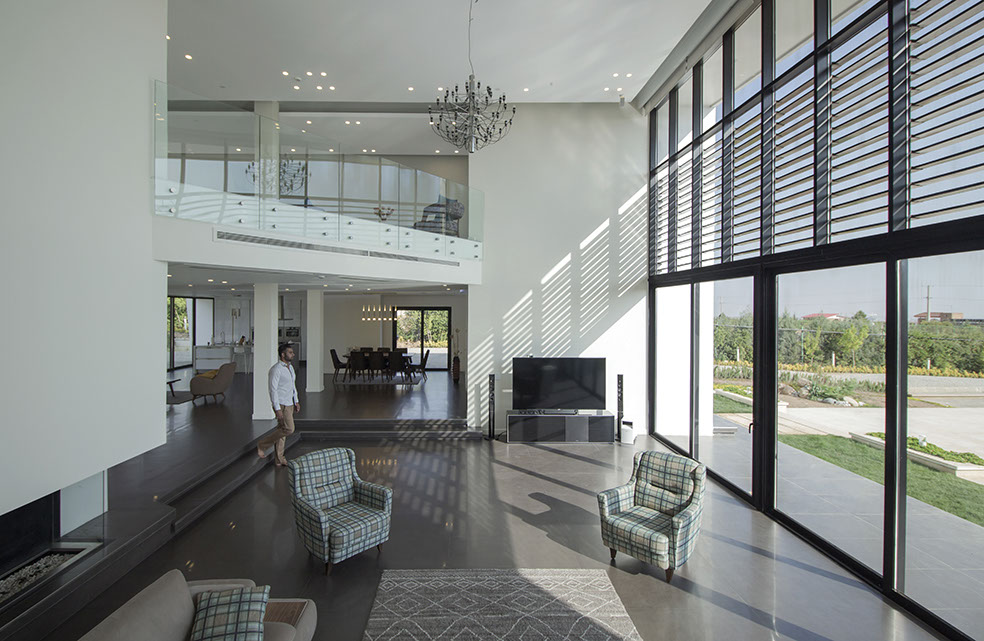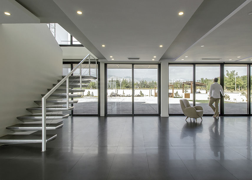 جداره شیشهای بلند امکان بیشترین بهرگیری از ارتباط درون با محیط باغ و همچنین یکپارچگی در فضای داخلی بین دو طبقه فراهم کرده. در کنار ویژگی های نام برده، استفاده از باد غالب برای تهویه طبیعی نیز مد نظر بوده است. باد غالب در موقعیت سایت از غرب می باشد که در صورت باز بودن بازشوها در نمای جلو و پشت جریان طبیعی قابل توجهی بوجود می آید – که به خاطر وجود ووید امکان وجود جریان در دو طبقه میباشد.