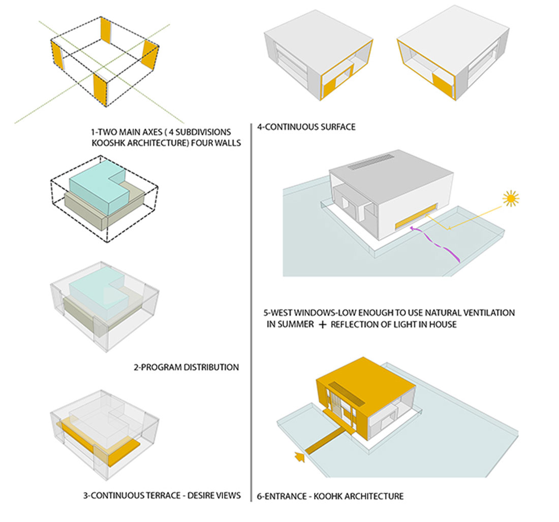 در طراحی ویلای ساوه، از فرم مکعب با تاکید بر هندسه چهارتایی استفاده شده است. مکعب شکلگرفته از اتصال این چهار دیوار، پوستهای است برای جمعآوری فضاهای نیمهباز و بسته درون، زیر یک سقف و ایجاد تمامیت بنا. در طراحی بنا، از قرار دادن فضای تهی داخلی در مرکز هندسی و تقلید از نمونه سنتی کوشک پرهیز شده است و در عوض، سطوح نیمهباز به شکل پیچیده چند L متقاطع در ضلعهای شمال، شرق و جنوب ساماندهی شدهاند.